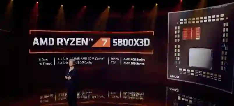 AMD 自 2016 年以来一直在使用物理 AM4 插槽,发布会上,AMD 正式发布了首个采用 3D V-Cache 技术的 CPU,Ryzen7 5800X3D 处理器,兼容 AM4 插槽。该处理器具有 8 个核心 16 个线程,最高 4GHz 运行频率,以及 64MB 的 3D 缓存和 32MB 的 2D 缓存,使用 AM4 插槽并通过在处理器上堆叠 L3 缓存来提高速度。这既增加了缓存的带宽,也增加了缓存的数量;与 5800X3D 的 96 MB 相比,标准 5800X 仅包含 32 MB 的缓存。
