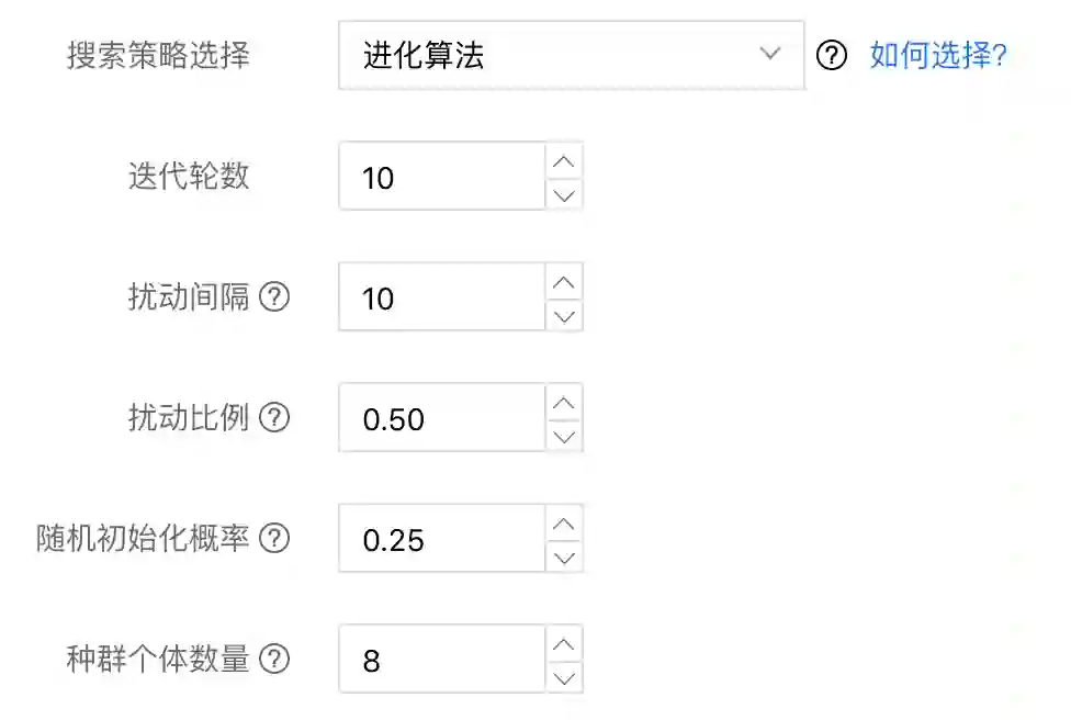 其它选项和贝叶斯搜索的含义一致,也不重复了。进化算法的配置需要对算法的原理有一定的了解,如果对算法不明白的,就直接用百度给的默认值吧!