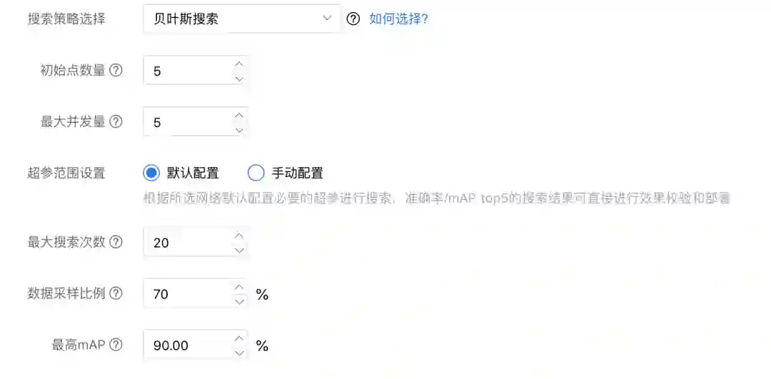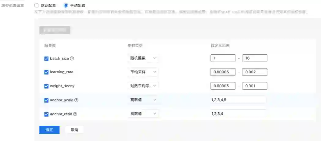 可以是默认配置,也可以手动配置。默认的话百度的工程师们已经帮我们对不同网络、GPU 卡型设置了一个基本靠谱的搜索范围,直接用就可以。当然也可以手动配置,可以自定义各个超参的范围,可以看到物体检测支持以下这些超参自定义搜索范围: