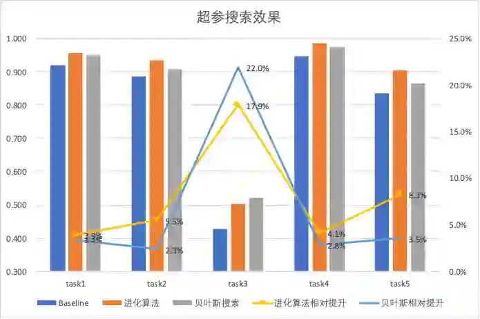 图中左边纵轴为模型的准确率,右边纵轴为超参搜索算法在效果上提升的比例。可以看到在不同数据集上使用超参搜索后效果均有提升,在默认参数精度已经超过 85% 的情况下,使用超参搜索仍能提升约 5%,在默认参数效果较差的情况下,超参搜索的提升效果更为明显,可高达 22%。