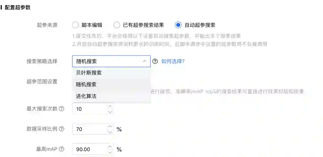 目前 BML 支持了三种超参搜索算法,如图,分别是