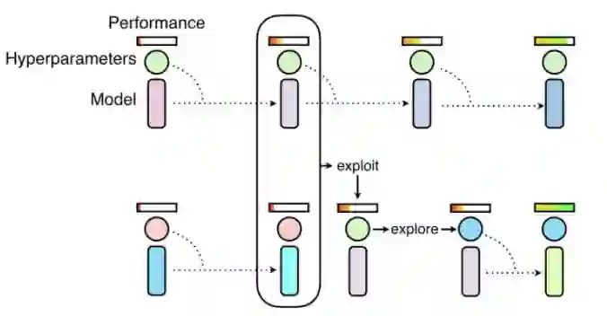 进化算法是一种基于种群概念的超参搜索策略,把超参配置视为一个种群,并行优化多个种群并在种群内部进行优胜劣汰的筛选,最终输出最佳模型。这个过程(如下图所示)是从遗传算法获得的灵感,种群的初始化采用随机的方式生成,个体的优胜劣汰具体指利用(exploit)和探索(explore)两个步骤,不仅可能会从表现较好的个体中复制参数,它还能通过随机扰动修正当前的值而探索新的超参数组合。
