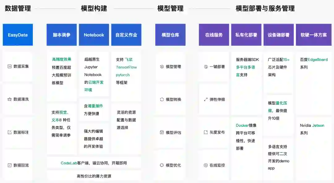 从数据采集、数据清洗、数据标注、智能标注与多人标注、模型训练生产到模型管理、云端及离线推理服务管理等 AI 开发过程的全生命周期管理功能。
