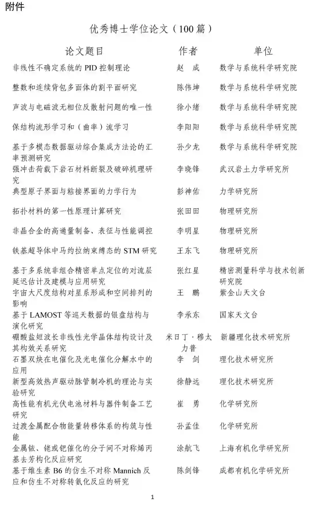 经评审,数学与系统科学研究院赵成的博士学位论文“非线性不确定系统的PID控制理论”等100篇博士论文被评为2020年度“中国科学院优秀博士学位论文”,现将评审结果予以公布。