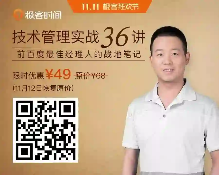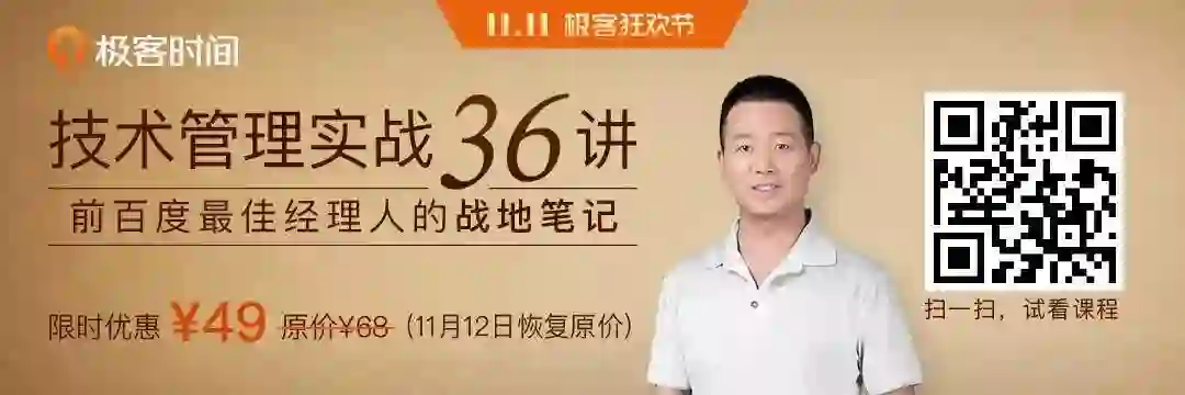 《技术管理实战 36 讲》专栏限时优惠价¥49,11 月 12 日恢复原价¥68,11 月 24 日会涨价至¥99。