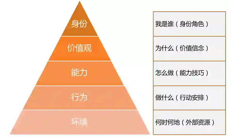 显然,上级是希望新经理通过认知的改变,从而达到他们能力和行为上的改善。这恰恰呼应了罗伯特·迪尔茨的“NLP 逻辑层次图”,一个人的行为、能力、价值观,都源于一个最根本的认知,就是自我角色的设定。