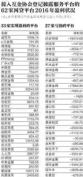 从利润水平看,宜人贷处于行业内较高水平。季度盈利已经达到2.69亿,2016年全年盈利超过11亿,这在全行业是什么水平?截至8月2日,已有62家网贷机构接入中国互联网金融协会登记披露服务平台。新京报统计显示,除2家平台没有披露财务信息外,60家平台中,有27家去年净利润亏损,33家实现盈利,盈利平台占比55%,亏损平台占45%。