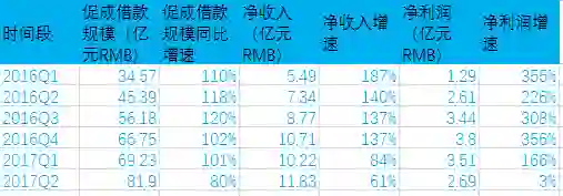 ),较2016年同期增长61%。从近几个季度的表现看,伴随着促成借款规模的增速趋向平缓,收入增速从之前的翻倍增长向平稳速度靠拢。