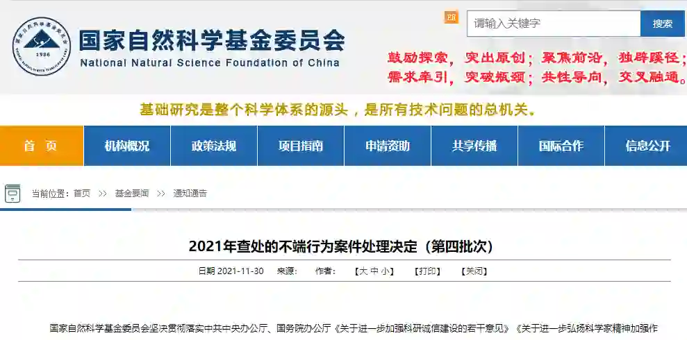 11月30日,国家自然科学基金委员会公布了2021年查处的不端行为案件处理决定(第四批次),将其中给予通报批评的5份处理决定(网络发布版)予以公布。