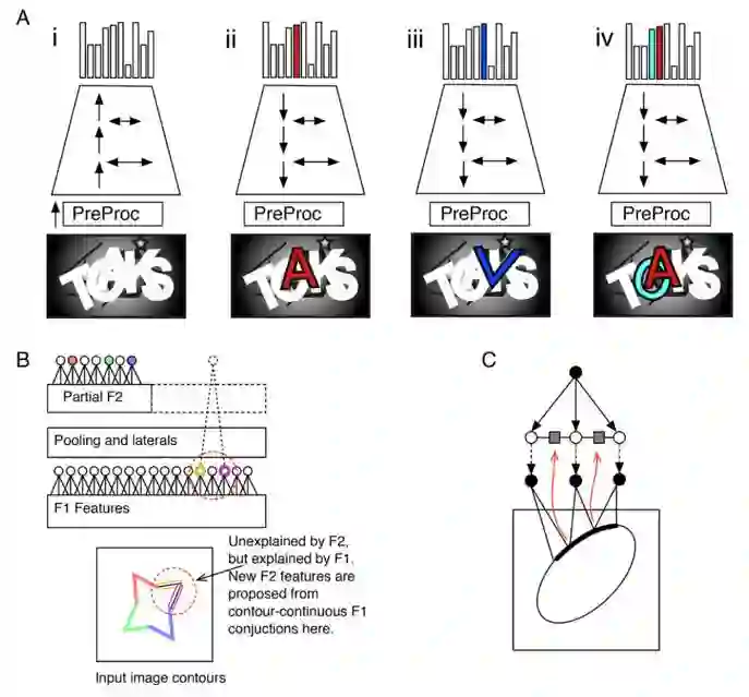 图5. RCN的推理算法。(A) (i) 通过前向传递,包括侧连接传递,生成字符假设。这里PreProc是一类Gabor算子,生成像素上的边界概率。(ii) 反向传递和侧连接传递从之前的假设中选取了“A”。(iii)“A”和“K”之间产生了一个错误的假设“K”,可以通过上下文解析消除错误假设。(iv)多个假设联合解释了图中的字母,包括对分离、遮挡的推理。(B)第二层上的特征学习。着色圆圈代表激活的特征,虚线圆圈代表最终选取的特征。(C)从边缘的相邻结构中学习侧连接。(摘自[1])