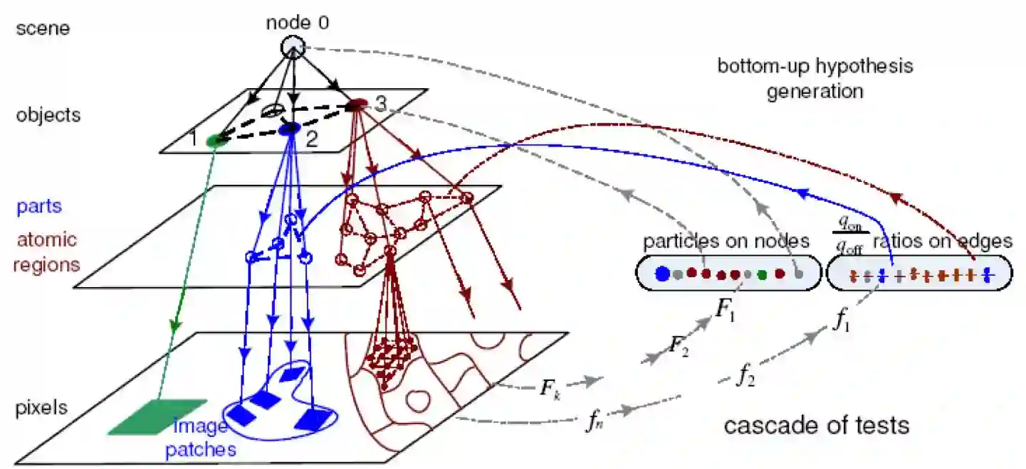 图4. 基于与或图的推理算法示例图。自顶向下产生式模型和自底向上判别式模型统一示意图,两者结合计算产生解译图。自底向上判别式模型主要进行两种测试,一是对分层结构中的每层中的节点本身进行测试,如图中Particles on nodes,二是多测试所得的节点之间的关系进行测试,如图中Ratios on edges,两种测试都是在多层上同时进行。测试所得结果作为“提议(Proposal)”驱动自顶向下的马尔可夫链跳转或扩散,或在一些简化的假设下,直接进行(近似)动态规划推理。(摘自[9])