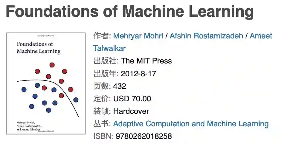 推荐大家读一下《Fundation of Machine Learning》!我相信无论是小白还是行家,都会从这本书中得到更多新的见解。
