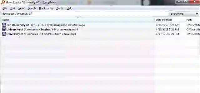 上面你可能已经看出来了,查询关键字中的空格,代表“且”的意思,即两个关键词中间如果有空格的话,代表同时包含两个关键词。但如果我想查询的关键词本身包含空格怎么办呢?可以用双引号把它们括起来,这样everything就会把它看待成一个词了。例如,我想查询downloads目录下包含university of bath的文件,可以写:downloads "university of"