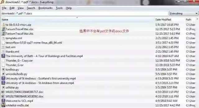 不包含由!代表,例如,我们想搜索downloads目录下不是pdf文件的其他文件,可以这样写:downloads !.pdf !.docx