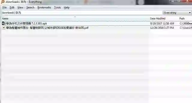 如果只想搜索某目录下的文件,则可以用目录加反斜杠,加空格,加关键词的方式进行搜索,例如:downloads 华为