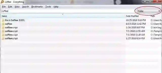 如果只想显示符合条件的目录,鼠标点选右上角的下拉框,把显示范围从Everything(全部),改为folder(文件夹)