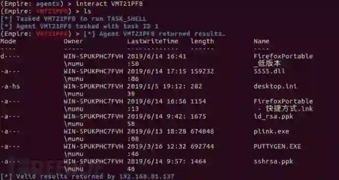 6) 通过interact命令则可以使用以建立的控制信道控制受控主机,如通过简单的ls命令测试成功如下图: