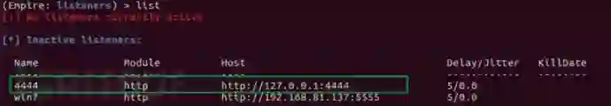 listeners #进入的界面下可输入list查看以设置的监听uselistener http #输入 info查看必填参数set Name 4444 #本次实验通过SSH隧道通信,因此设置监听127.0.0.1:4444set Port 4444set Host 127.0.0.1execute #创建命为4444的监听,监听127.0.0.1:4444上通信数据