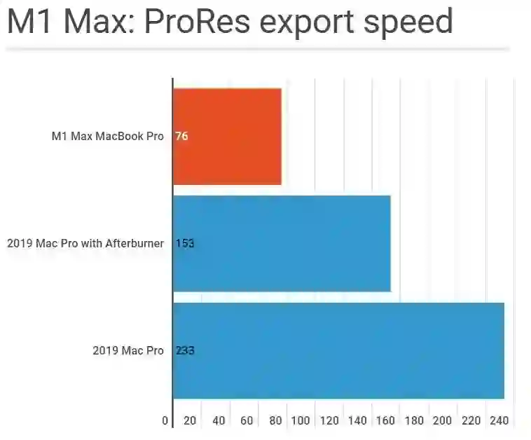 M1 Max 对ProRes视频导出的测试显示,高端2021 MacBook Pro的速度是2019 Mac Pro的三倍。Macworld指出,即使你将Afterburner加速卡安装到Mac Pro上,M1 Max MacBook Pro的速度仍然是Mac Pro的两倍。