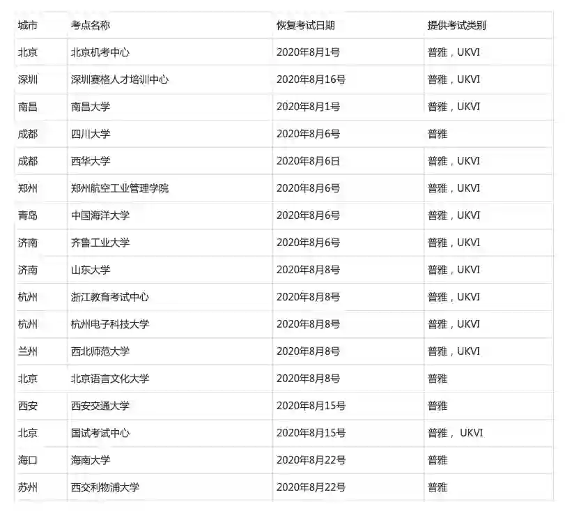 此外,GRE考试在7月已恢复的考点基础上,自8月21日起新增6个复考考点,包括山东科技职业学院(潍坊)、北京外交人员服务局、西安交通大学、国试考试中心(北京)、山东大学、西交利物浦大学等。