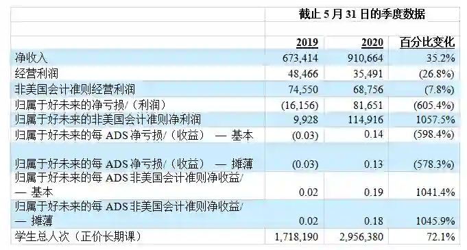 7月30日,好未来公布了2021财年第一季度未经审计财务报告。报告显示,公司净收入从上年同期的6.734亿美元增长到本季的9.107亿美元,同比增幅为35.2%;净利润为8170万美元,上年同期净亏损为1620万美元。
