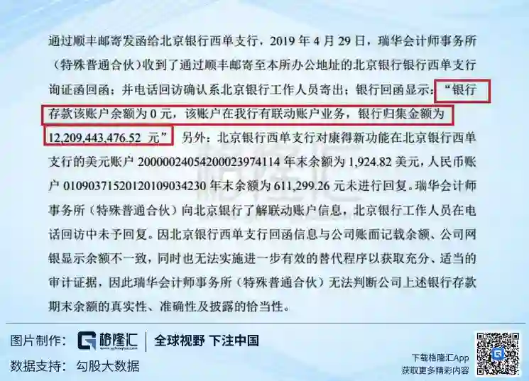 随后康得新的审计公司——瑞华会计师事务所——发函给北京银行西单支行问询,不久后收到了回函。银行回函显示:“银行存款该账户余额为0元,……”。