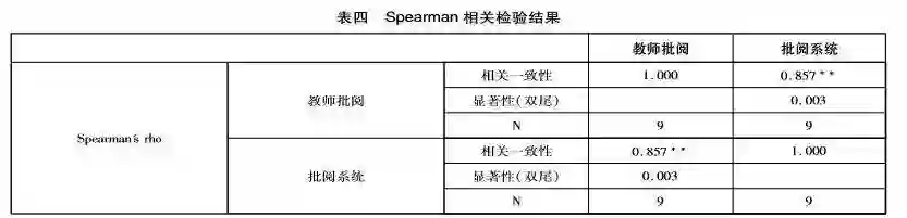 研究者通过两种方式进行系统的一致性验证:一种通过SPSS20.0的Spearman检验进行分析,另一种基于批阅允许误差临界值对批阅差异值(教师批阅分数和社会化批阅均分的差)进行一致性比较(如果差异值超过临界误差,那么该作业批阅结果不一致)。Spearman相关检验结果显示,相关一致性值为0.857,显著性为0.003(见表四)。这说明,教师批阅结果和社会化批阅均分存在一致性相关。从差异值来看,9份作业中,5份作业差值小于临界误差3分,一致程度为56%,其他4份作业的差异值在5分以内,说明社会化批阅工具在一定程度上能保证批阅的一致性。从上述两种方法的分析结果看,作业社会化批阅工具的批阅一致性效度较好,可以在减轻教师压力的基础上保障批阅的权威性,为促进学习者的作业评价和系统的大规模应用提供了契机。
