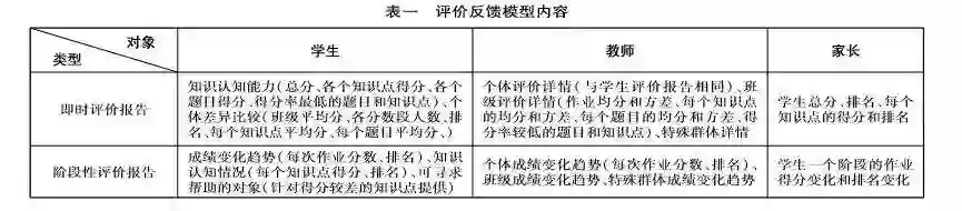 评价报告的生成和输出模块为学生、家长和教师提供了即时的作业反馈报告。报告按照系统预设的评价模型为用户输出可视化作业评价结果(见表一)。