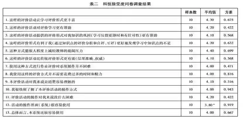 从表二可以看出,认知有用性六道题旨在验证系统在解决前文所述作业批阅问题的效果,即能否有效减轻教师的批阅压力,促进作业的即时反馈和过程性评价,促进基于知识点的作业评价和学生知识点的有效巩固。结果显示,六道题平均得分在4分以上,说明社会化批阅工具可以较好地解决上述问题,丰富了作业评价的形式,实现了社会化批阅的预期目标。在认知有用性的访谈中,用户普遍反映相对于传统的作业评价、MOOC的自评互评等,作业的社会化批阅具有以下优势:1)在减轻教师压力的同时,对作业的评价更即时,更具针对性,也更能揭示学习者知识点方面的不足;2)批阅工具设置了较严格的批阅质量保障机制,评价结果更权威;3)可视化评价结果有利于教师和学习者更直观地发现学习中存在的问题;4)以作业批阅和评价为基础,建立了以教师、学科专家、家长和学生为主要关系节点的关系网络和评价共同体,有利于充分利用社会化力量促进学习者的评价和发展。认知易用性的七道题旨在验证系统是否容易理解和使用,结果显示只有第12题分数低于4分,说明系统总体运用便捷,不会增加用户使用的认知负荷。用户访谈显示,用户对第12题的回答是,界面链接层级跳转较多,容易产生困惑,需要对易用性进行完善。
