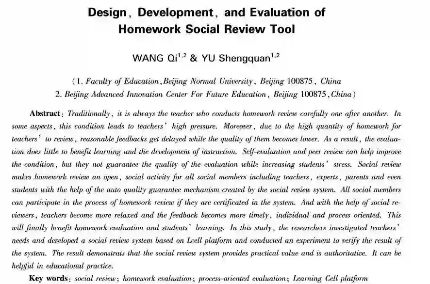 传统教学中作业批阅以全批全改和精批细改为主,造成了教师批阅压力大、作业反馈不即时、评价结 果缺乏针对性、不利于开展过程性评价问题。自评、 同伴互评一定程度能减轻教师批阅压力,但质量不能保证。本研究针对上述问题,提出了作业社会化批阅方法,将作业批阅权限公开化,充分利用社会化批阅专家、家长、学生的力量和社会化批阅系统中内置的批阅可信度保障模型,在保证作业批阅结果准确性基础上,降低教师的批阅压力、促进作业反馈的即时性、个性化,进而推动作业过程性评价和学生学习效率提升。在社会化批阅理念指导下本研究访谈了教师作业批阅需求,并基于学习元平台设计和开发了作业的社会化批阅系统并选取了PPT的使用课程进行实验,结果表明,作业进行访谈社会化批阅系统具有较好的实用性和易用性,其批阅结果也与教师批阅结果存在较大一致性,从而验证了作业社会化批阅方法具备实践价值。