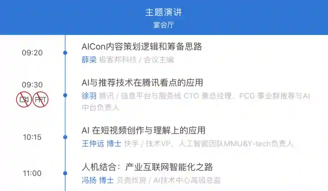 演讲嘉宾除了来自阿里、腾讯、华为、字节、百度、美团、小米、爱奇艺、快手、京东等头部大厂之外,还有第四范式、图森未来、Hulu、科大讯飞、明略科技、爱数智慧、索信达控股、商汤科技、纽劢科技、出门问问、贝壳找房、Pony.ai、西山居、微众银行、BIGO、OPPO、红棉小冰、优必选科技、eBay...... 覆盖各行各业。讲师们将从实践出发,依据热点话题,分享人工智能前沿技术创新和落地实践。