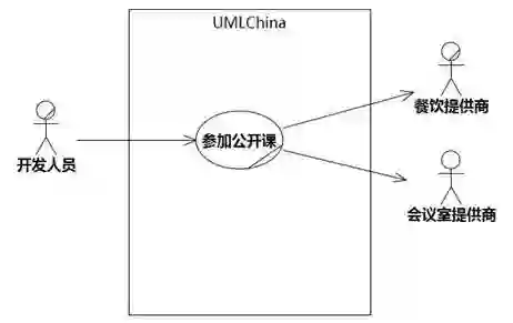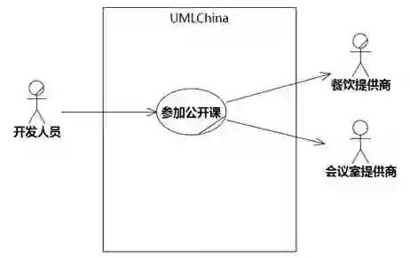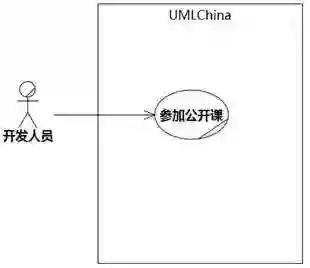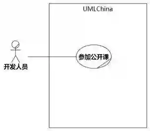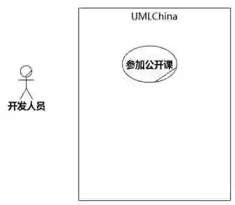 UMLChina业务系统改进的组织是UMLChina组织,第一个迭代周期只需要关注最值得改进的业务用例。根据愿景推测,参加公开课的流程最值得改进,业务用例图只需要先画出这个业务用例就够了。UMLChina组织当然还有很多别的用例,包括所有公司都逃不掉的用例——政府要向它征税,只不过改进纳税的流程离愿景比较远,所以我们不画出来,但不代表它不存在。