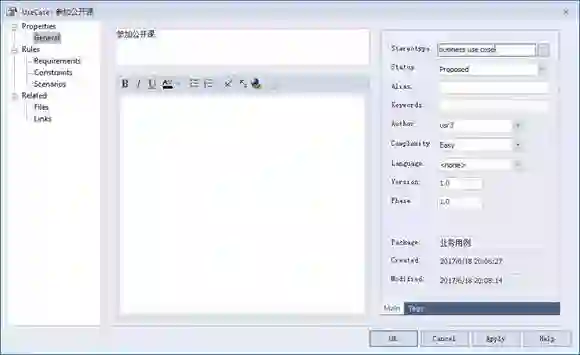 【步骤4】单击工具箱中的,单击边界框内,在文本框输入参加公开课。双击参加公开课用例,单击属性框Stereotype栏右侧的按钮,在Stereotype对话框选择business use case(也可以在属性框Stereotype栏直接输入business use case),单击OK,再单击OK。