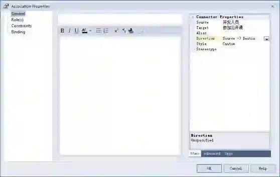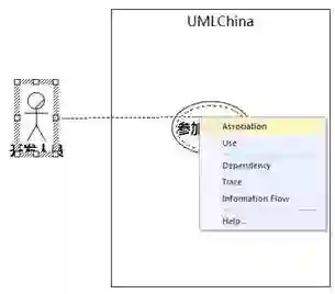 【步骤5】单击开发人员执行者,按住开发人员执行者右侧的小箭头(Quick Link),拖到参加公开课用例上,松开鼠标按键,从快捷菜单中选择Association。双击执行者和用例之间的关联线,在弹出属性框的Direction选择框中选择Source→Destination。