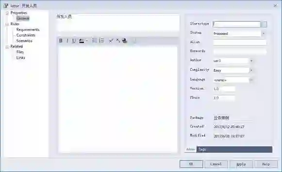 【步骤3】单击工具箱中的,单击边界框的左侧,在文本框输入开发人员。双击开发人员执行者,单击属性框Stereotype栏右侧的按钮,在Stereotype对话框选择business actor(也可以在属性框Stereotype栏直接输入business actor),单击OK,再单击OK。