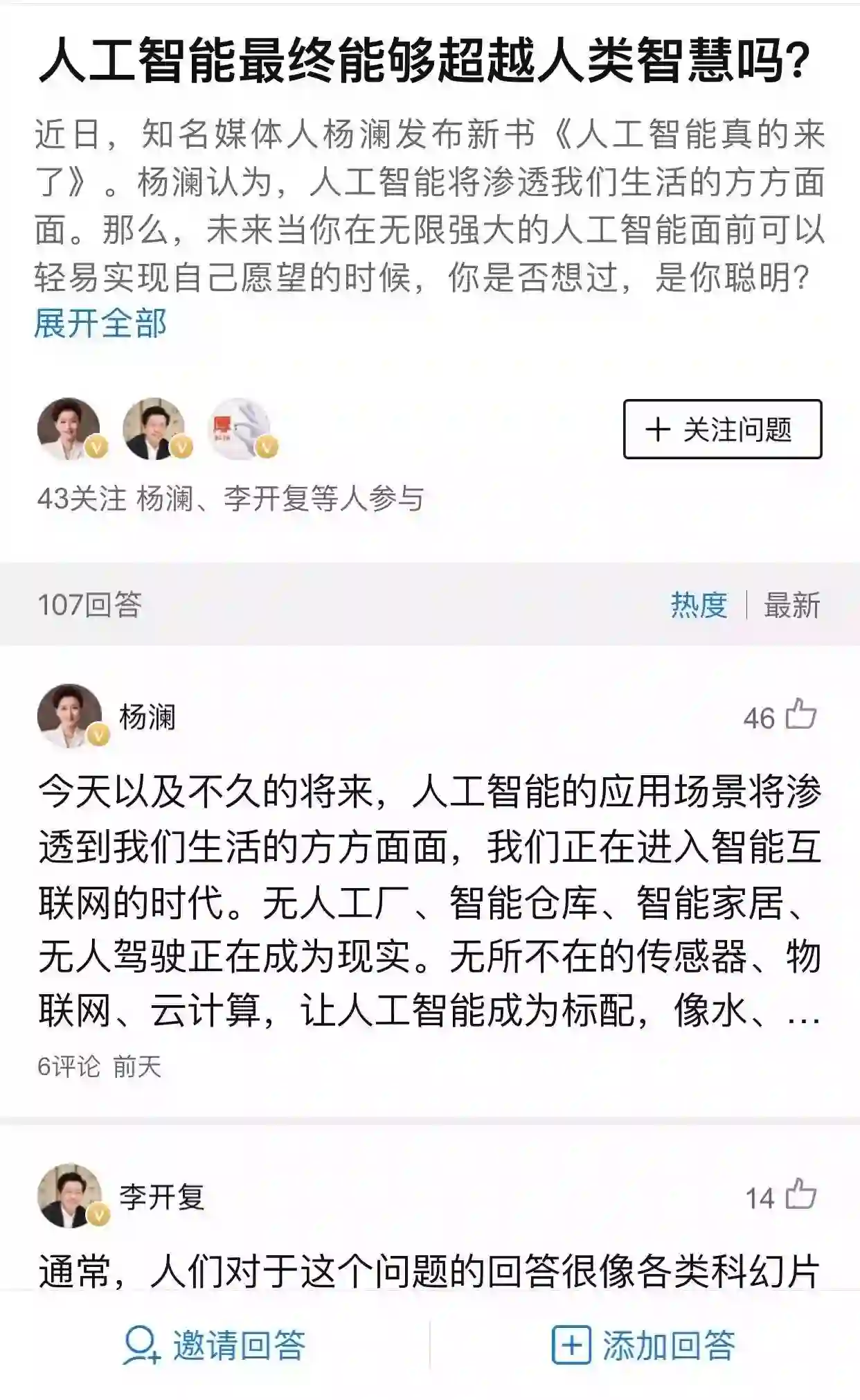 除了杨澜和李开复,还有许多资深自媒体也对这个问题进行了深度解答,若想了解更多人工智能的相关信息,点击“阅读原文”,进入“企鹅问答”参与讨论。