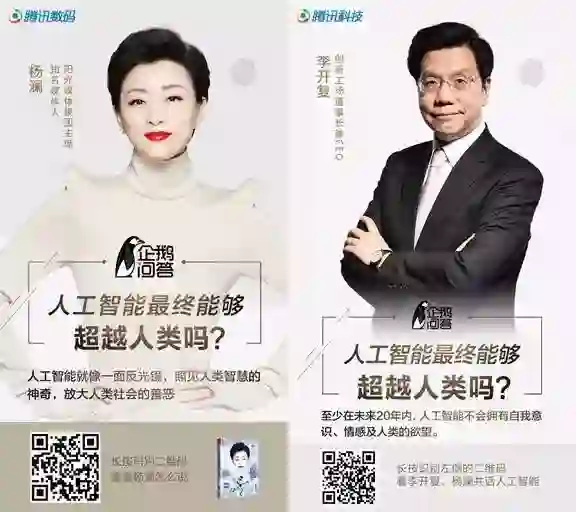 针对这一问题,近日,知名媒体人、阳光媒体集团主席杨澜,与创新工场董事长兼CEO李开复,在企鹅问答上展开了一场有关“人工智能能否超越人类智慧”的讨论。