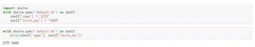 当使用关系数据库是一种浪费的时候,shelve 模块可以为 Python 对象提供一个简单的持久性存储选择。就像使用字典一样,通过关键字访问 shelf 对象。其值经过序列化,写入到由 dbm 创建和管理的数据库。