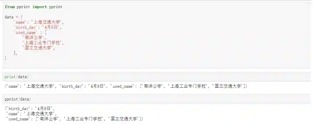 我们在使用python开发时,总是会使用print大法来debug。当处理更复杂的数据结构,例如嵌套字典,print的输出就会显得非常不规则,引起不适,这时候就需要pprint了。