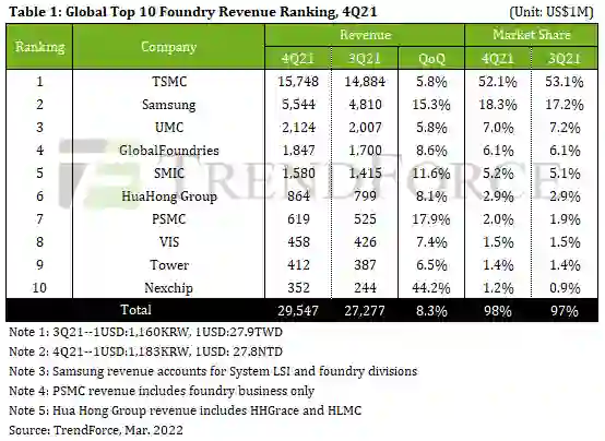据TrendForce的报告,中芯国际的市场份额仅次于台积电、三星、联电和格芯。其中,第四季度台积电独揽52.1%的市场份额高居榜首,而中芯国际仅占比5.2%。