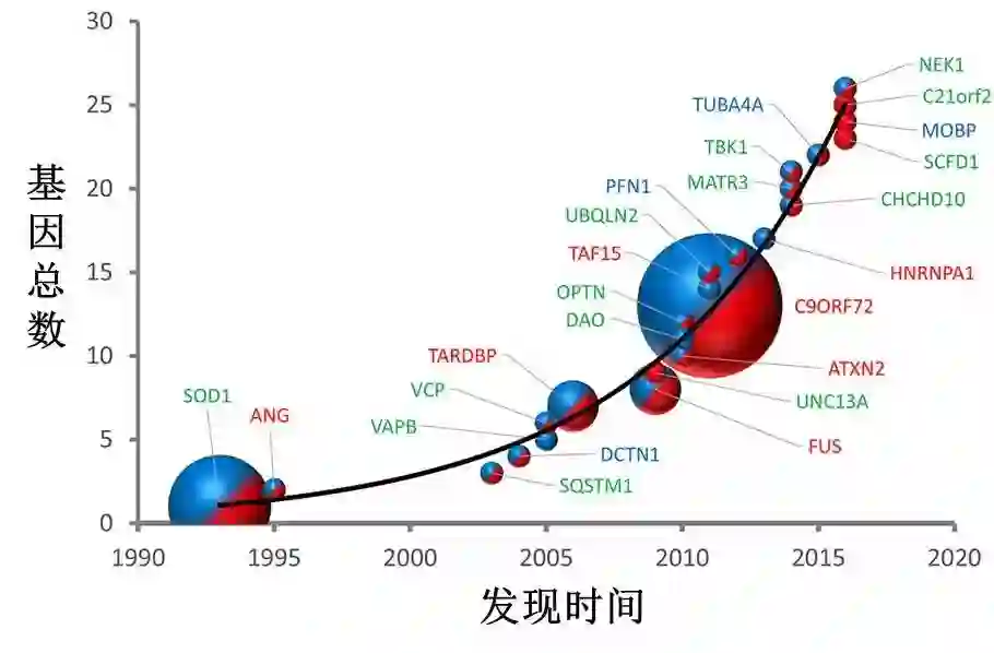 图2 渐冻症致病基因发现史。每个小球代表一个和渐冻症有关的基因,球越大代表影响的患者越多。(图片来源:resident360.nejm.org)
