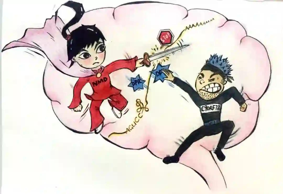 图5 名叫NMD的红衣女侠剑斩错误mRNA,与造成ALS的C9orf72恶棍对抗。(图片来源:徐进实验室)