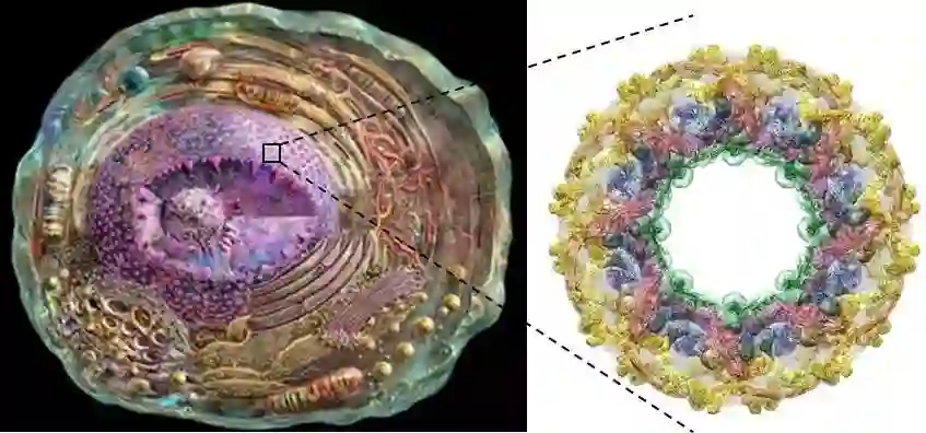 图3 左图为细胞结构(图片来源:Science);右图为放大的核孔结构。(图片来源:directorsblog.nih.gov)