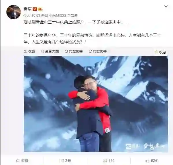在金山软件三十年庆典上,雷军抱住了求伯君:“三十年的岁月年华,三十年的兄弟情谊,刹那间涌上心头。人生又能有几个这样的战友?! ”