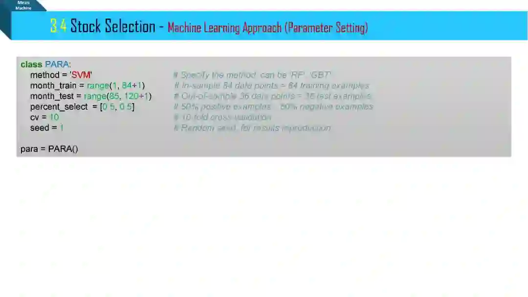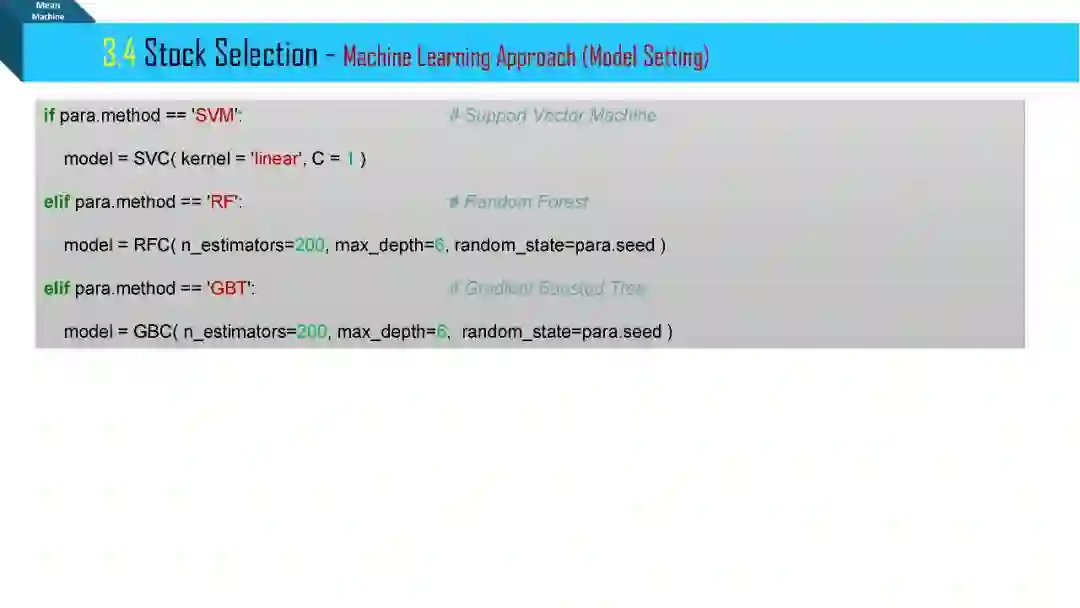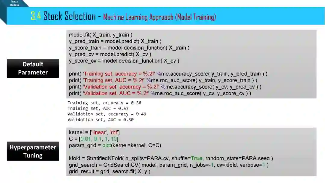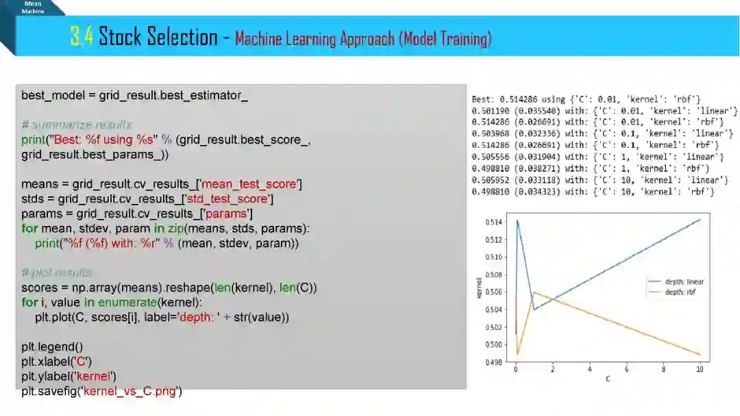 刚刚接触半年不到,也没有怎么花功夫在上面,基本上就是东看看西看看,从来没有系统的学它。学一个新东西最快的方式就是用一个具体的特例。我主要参照了华泰的研报 Python 实战那一期,用的是假数据,但是多加了一步机器学习调整超参数步骤 (GridSearchCV)。用的支撑向量机 (SVM) 加高斯核 (提高模型复杂度来处理高维数据) 和正则项 (减小模型复杂度来防止过拟合)。策略就是每期用 SVM 预测股票涨跌,但是关注的是涨跌的概率,将其排序,选出涨的概率最大 (涨幅不见得最大) 的若干股票。