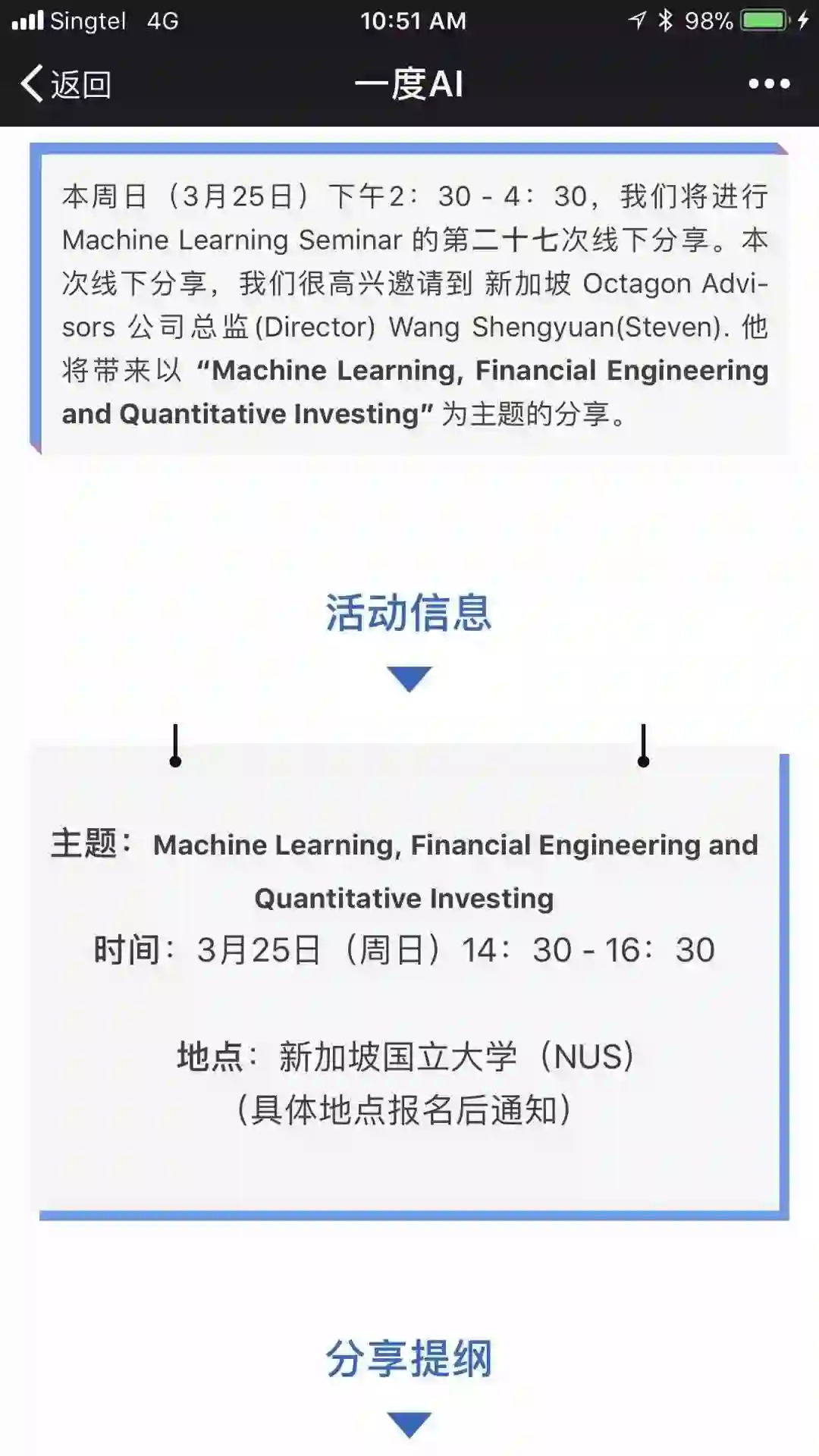 2018 年 3 月 25 号,在新加坡国立大学被 “一度AI” 邀请做了一个关于机器学习、金融工程和量化投资的演讲。进入王的机器公众号,在对话框回复 MFQ 可下载完整 PPT