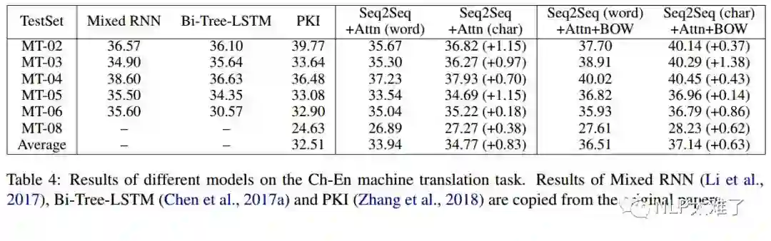 作者在基于中文语料的四个NLP任务(语言模型、机器翻译、句子匹配和文本分类)上进行了对比实验,比较word级模型和char级模型在这四个任务上的效果。