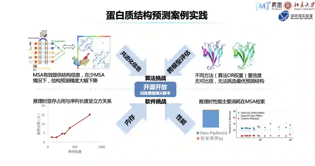 软件层面的问题主要为算法的内存消耗,算法占用的显存与序列长度是立方关系,如果基础软件内存优化做得不好,很容易导致显存爆炸。同时,推理时性能主要消耗在共进化信息检索。