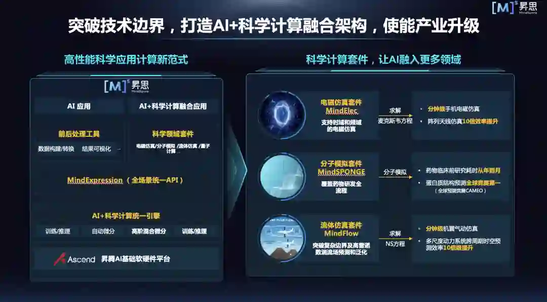 最后, MindSpore 不只针对生物计算方面有相应的实践,我们在汽车、能源、气象、航空航天、EDA、材料、金融等方面都有规划。希望通过支撑更多行业应用,帮助合作伙伴商业落地,完善我们国产基础软硬件的能力。目前已经有的,主要是电磁仿真、流体仿真、分子模拟。