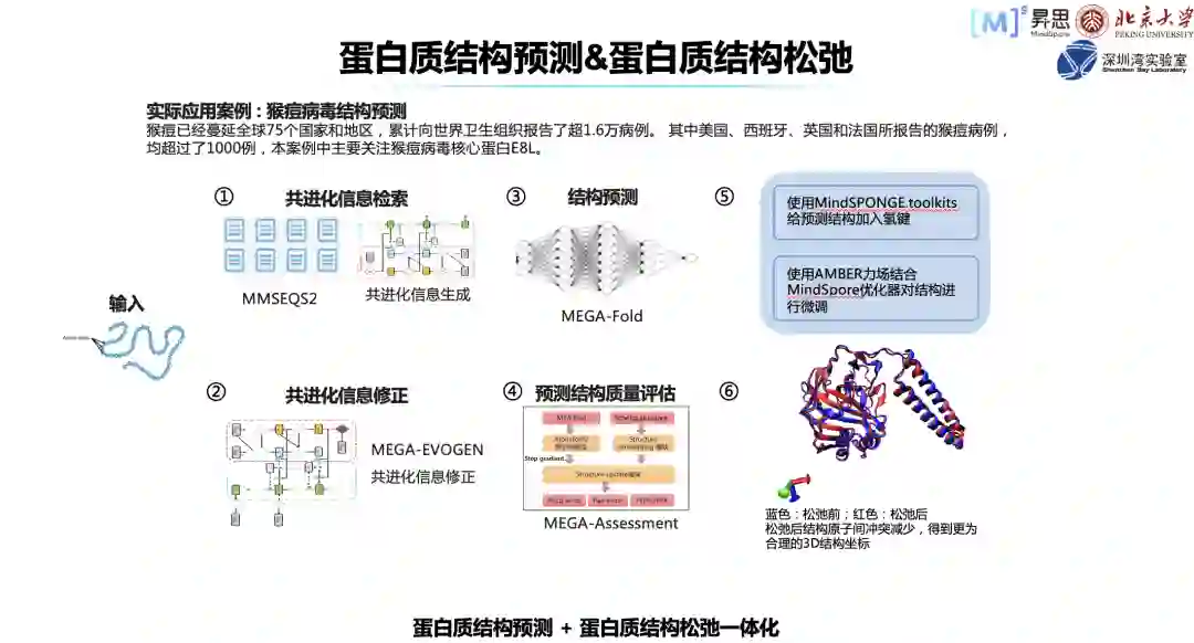 当前 AlphaFold2, 在网络推理使用 JAX,分子动力学过程则使用 OpenMM 进行。由于 MindSPONGE 有统一建模的体系和工具,能够把蛋白质结构预测做一体化的推理,会给出更合理的结构。